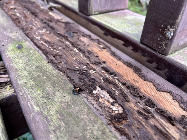 シロアリが木材を食い破った跡が見られます。