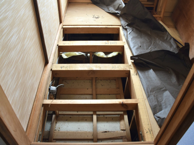 床下でシロアリが活動していると、床がふかふかしたり、音がしたりすることがあります。