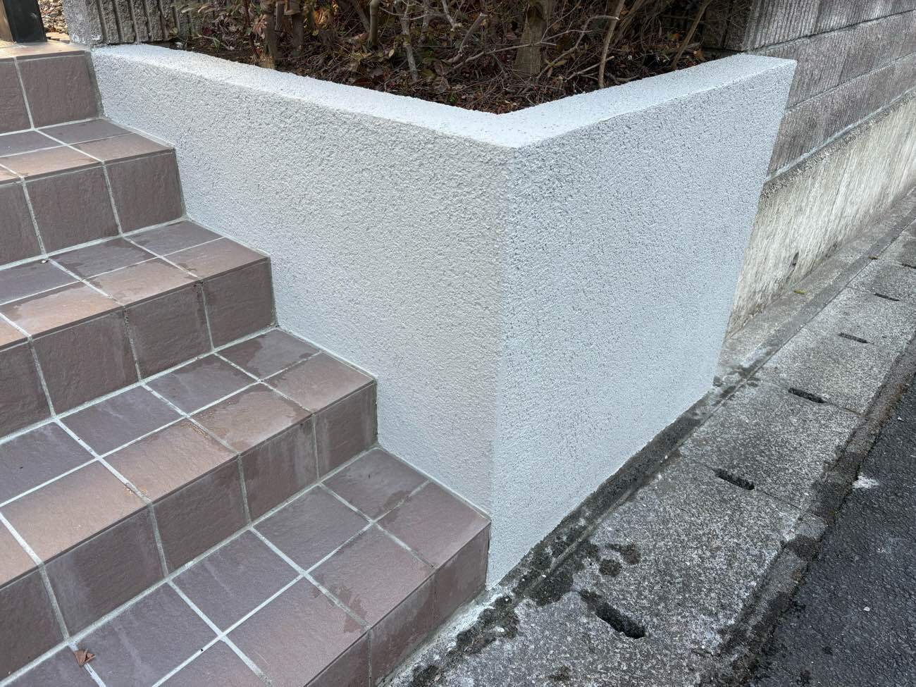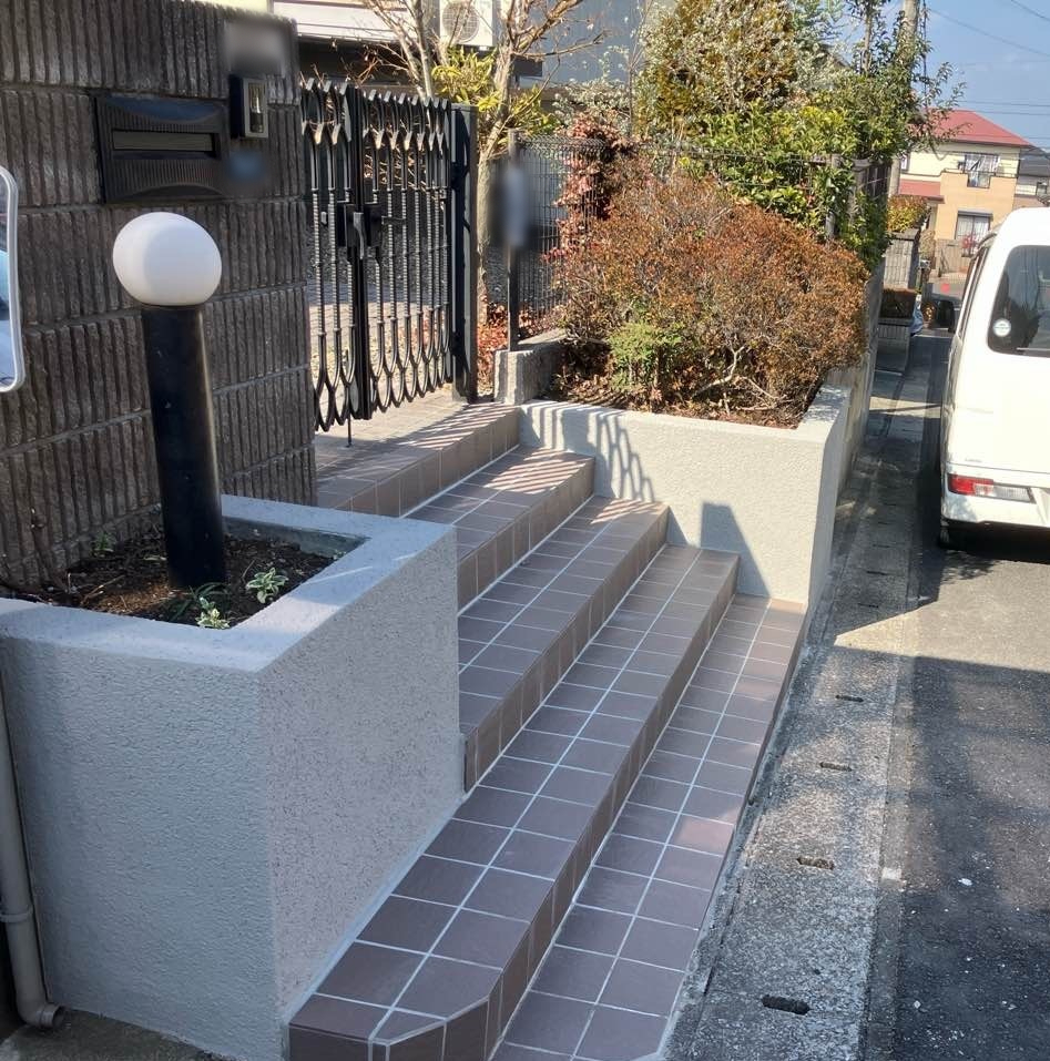 | ご提案のポイント | 相談内容を踏まえ必要箇所のタイルの張り替えをご提案いたしました。 見た目と仕様を変えたいとのことで、150角タイルも、少し色を変えてご提案いたしました。 また花壇の仕上がりも、花壇内に湿気がたまることを想定して、 コンクリート系の塗装で仕上げました。 |